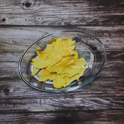 1、2个红蜜柚用盐水搓洗干净,用削皮刀削出薄薄的外皮备用