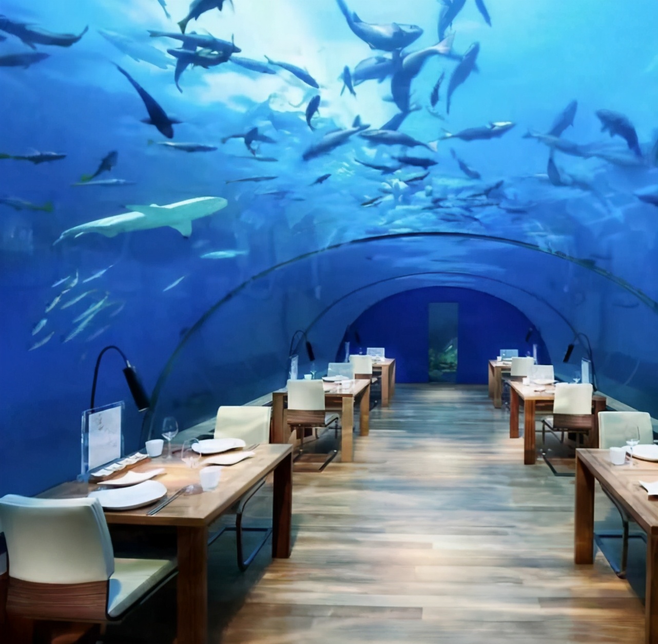伊特哈海底餐厅是世界上第一家全玻璃的海底餐厅,造价500万美元,这个餐厅建于2005年,位于马尔代夫的希尔顿旗下康莱德酒店。为了保证客人的用餐体验,这个餐厅每次最多容纳14个人。伊特哈海底餐厅位于印度洋海平面以下5米,天花板和墙壁都是透明的全景玻璃窗,即使在用餐,你也会不自觉望向玻璃外的海洋,看各种海洋生物穿梭在珊瑚礁之间的美丽景象。