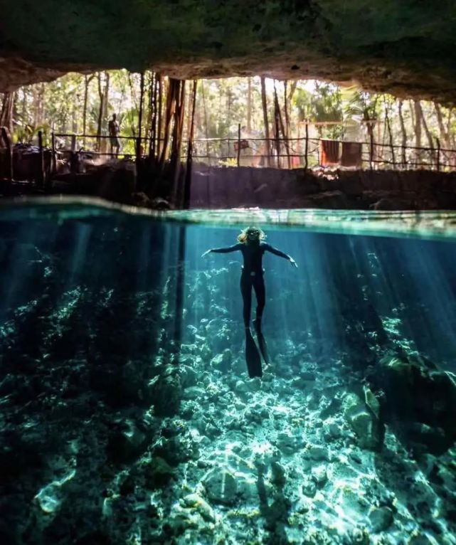 最不可思议的水下体验不一定是在海上,还有可能在地下。位于墨西哥的玛雅海岸有大量洞穴,供潜水爱好者探索,其中最引人注目的,是一个叫做多斯奥霍斯的神秘洞穴,也可以翻译成“两只眼睛”。因为这里有两个洞穴,其中一个充满了阳光,而另一个则非常黑暗。作为世界第三大水下洞穴,这里的海水清澈见底,浮潜爱好者可以在这里自由穿梭欣赏鱼和钟乳石。多斯奥霍斯一直保持着原生态环境,参天巨树和灌木杂草自由生长,宽敞的洞口折射着太阳光线,美丽的令人惊叹。这里全年的水温为25摄氏度,非常适宜潜水。多斯奥霍斯水下洞穴曾在多部影视作品中出现,2002年的电影《神奇洞穴之旅》、2005年好莱坞电影《洞穴》的部分场景就是在多斯奥霍斯的洞穴拍摄的。