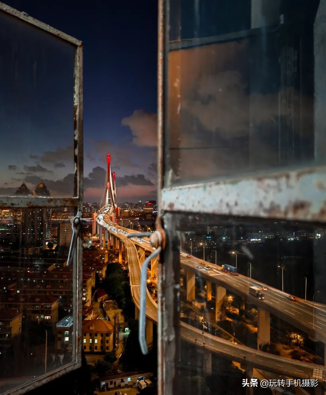 比如拍摄大桥,相信大部分的人会把手机伸出窗外拍摄,而这里摄影师黄利勇巧妙的应用锈迹斑斑的窗户作为前景,拍摄一张画中画的照片,突出一种新与旧、明与暗视觉空间感。