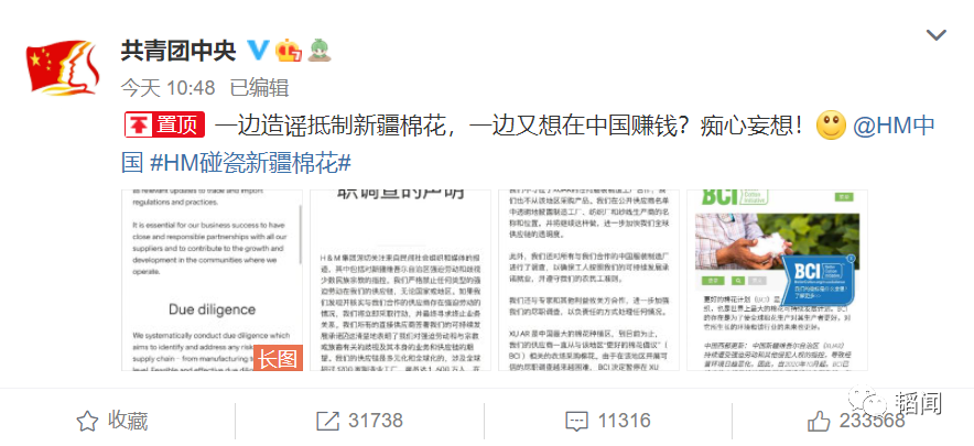 比如共青团中央::H&M吃饭砸锅!一边造谣抵制新疆棉花,一边又想在中国赚钱?痴心妄想!