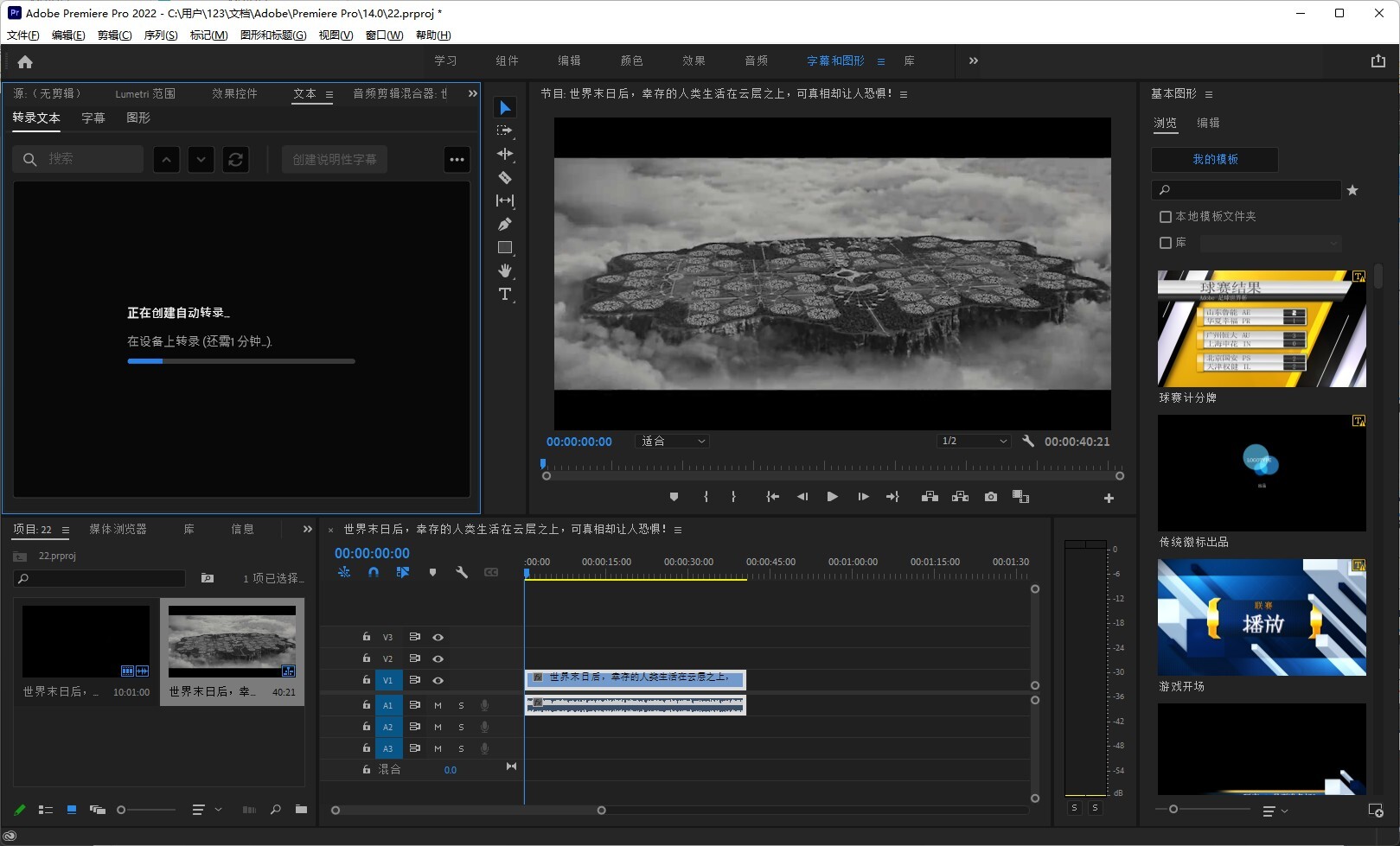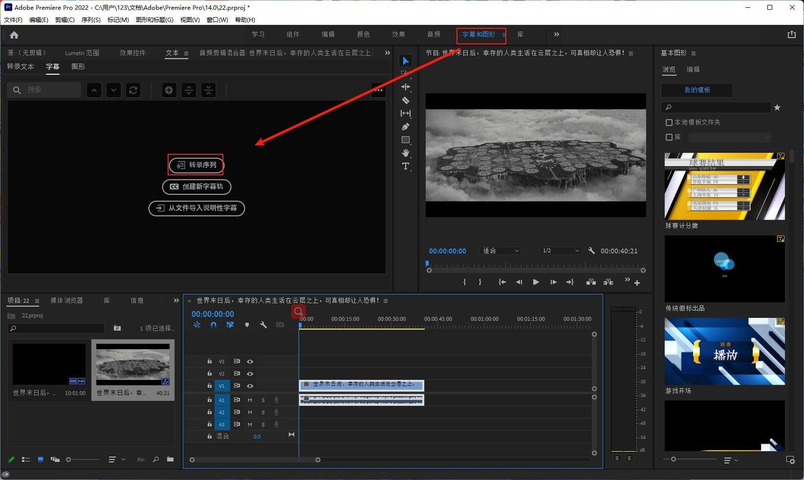 1、打开PR2022,导入一个要语音转字幕的视频或MP3,选择字幕和图形,然后点击转录序列