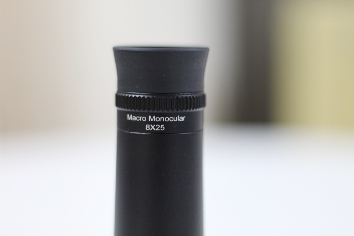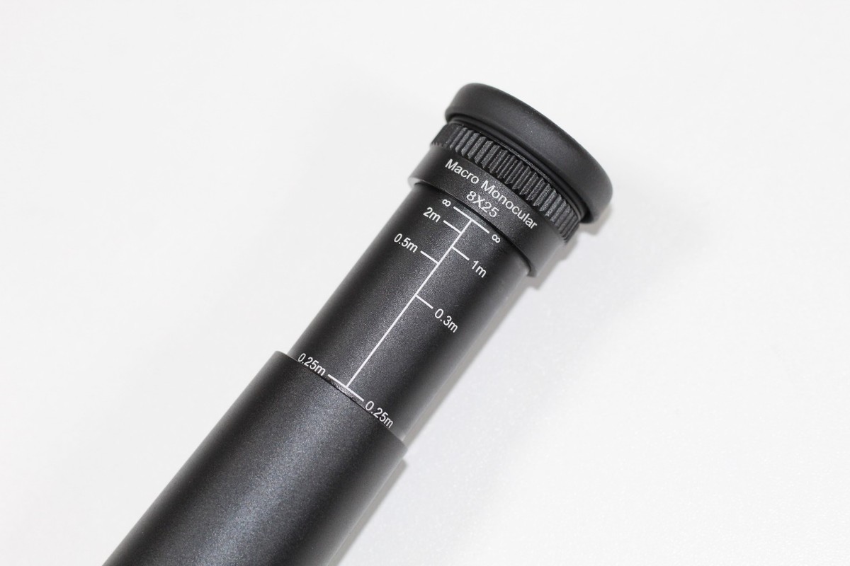 望远镜的目镜的出瞳直径为3.1mm,出瞳距离是10mm采用了可旋转的变焦方式,内壁上有刻度,这样我就可以清晰的观看到当前的焦距。目镜的边框上还印着8x25的标志,我们可以理解为支持8倍的放大。25mm的物镜。