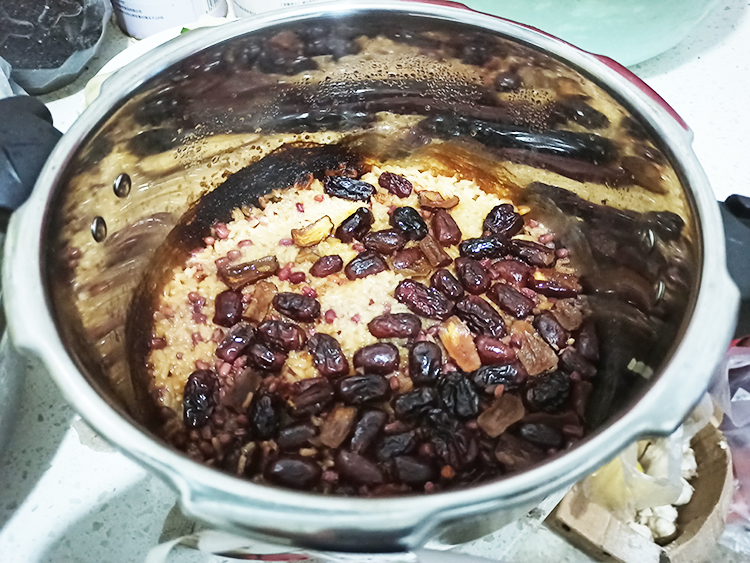 6、高压锅放完气以后,手柄上面小洞中的气阀下沉,我们就可以打开锅盖了。由于和家人视频,忘记了时间,这一锅八宝饭有点失败,大家在做饭的时候,一定不要像我这样,要专心才行。