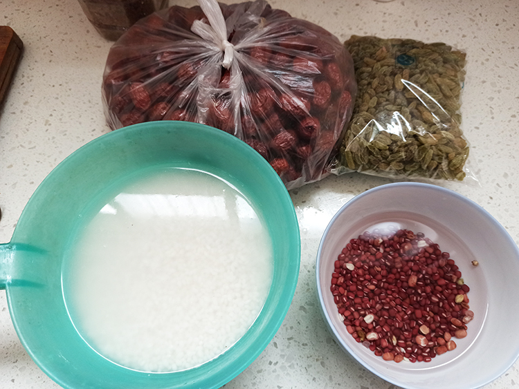 食材:大米适量、糯米适量、红豆适量、红枣适量、葡萄干适量。