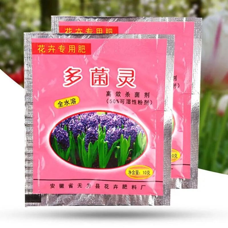 大家网购植物花卉或各类园艺器材时,经常会有商家送一些小包的复合肥、生根粉或多菌灵,就比如下图,保证基本都是这样,你觉得这些多菌灵是真的吗?