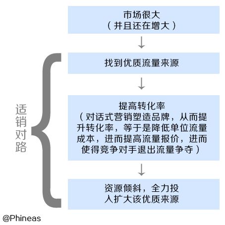 从传统商业来说,就是找到最适合开店的区域,比如小区门口(找到优质流量来源);然后优化产品组合,提升装潢和店员水平(提高转化率);最后疯狂copy,疯狂开店(资源倾斜,全力扩大该优质来源)。