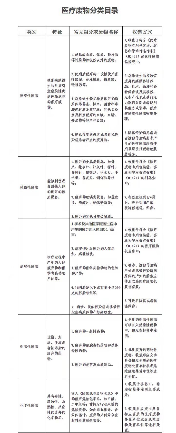 第二,在《医疗废物分类目录》中,对感染性废物、损伤性废物、病理性废物、药物性废物及化学性废物五类常见组分或废物名称进行了归类与细化,新增了收集方式,进一步明确了医疗废物的盛装方法和收集管理要求。