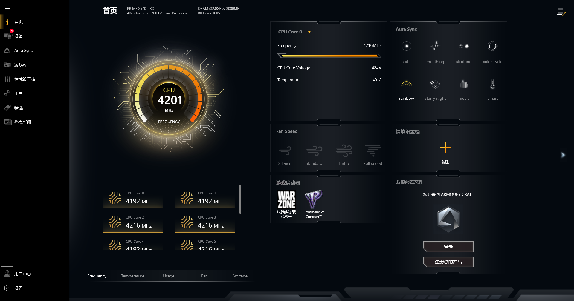 可以理解,毕竟华硕可不是只做键盘的,所以从功能性来说,一样完善。对于CPU,风扇,电压,温度等,都有相关展示,可以说装一个Armoury Crate奥创就足够了。