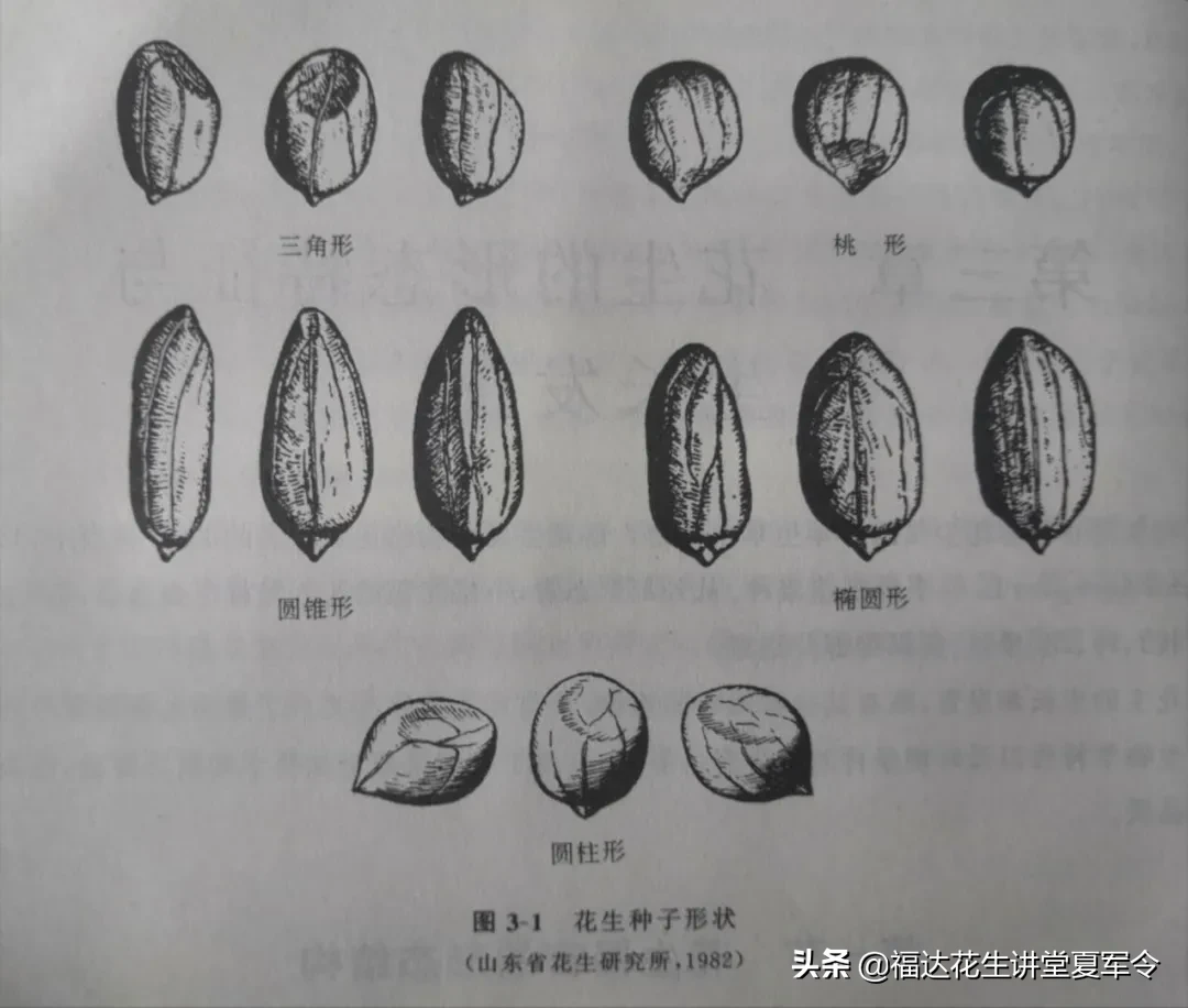 花生种子通称花生仁或花生米,着生在荚果的腹缝线上。种子外形可分为椭圆形、三角形、桃形、圆锥形和圆柱形五种(图3-1)。品种间种子形态差异较大,同时与栽培条件及在荚果内着生位置亦有一定关系。