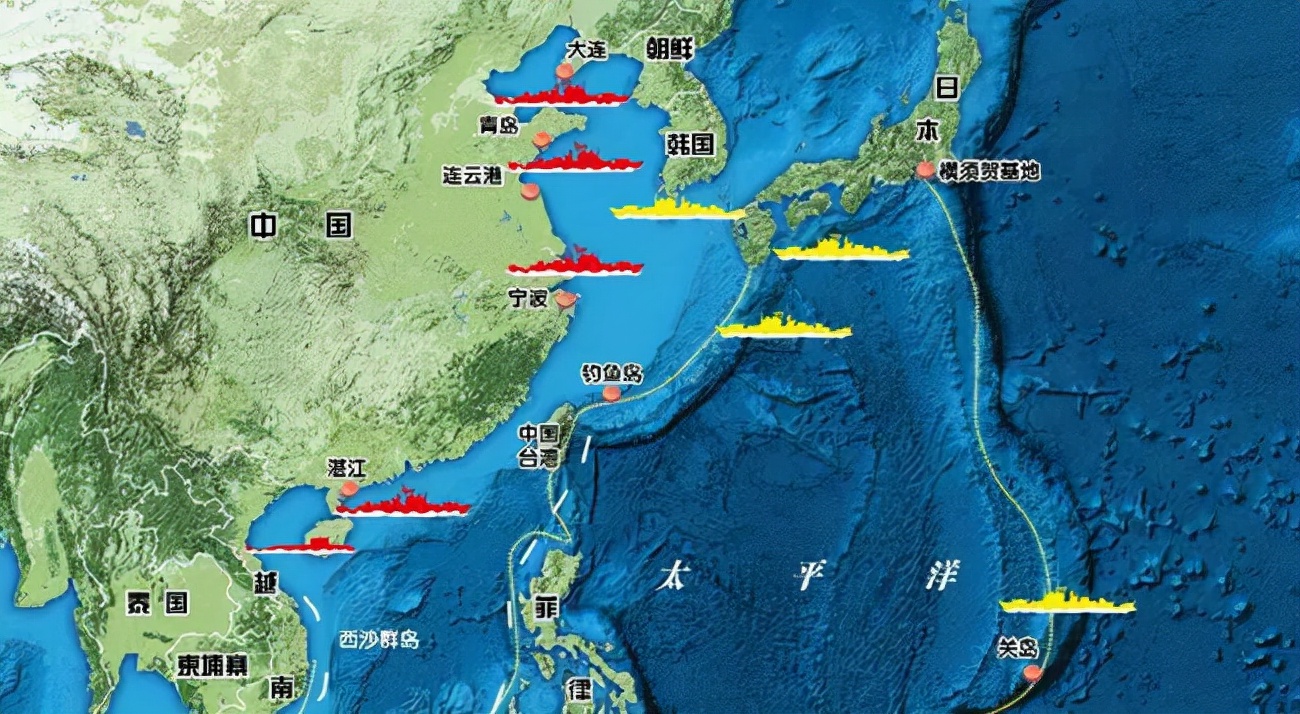 首先是没有比较宽广的出海通道,从最北方的日本列岛,到最南端的菲律宾群岛、印度尼西亚群岛,中国海军的前出路线被限制得相当死,北方是仅有40多公里宽的对马海峡,而后是大隅海峡,土噶喇海峡,奄美海峡,宫古海峡和与那国水道,均是大陆架末端的狭窄海峡。