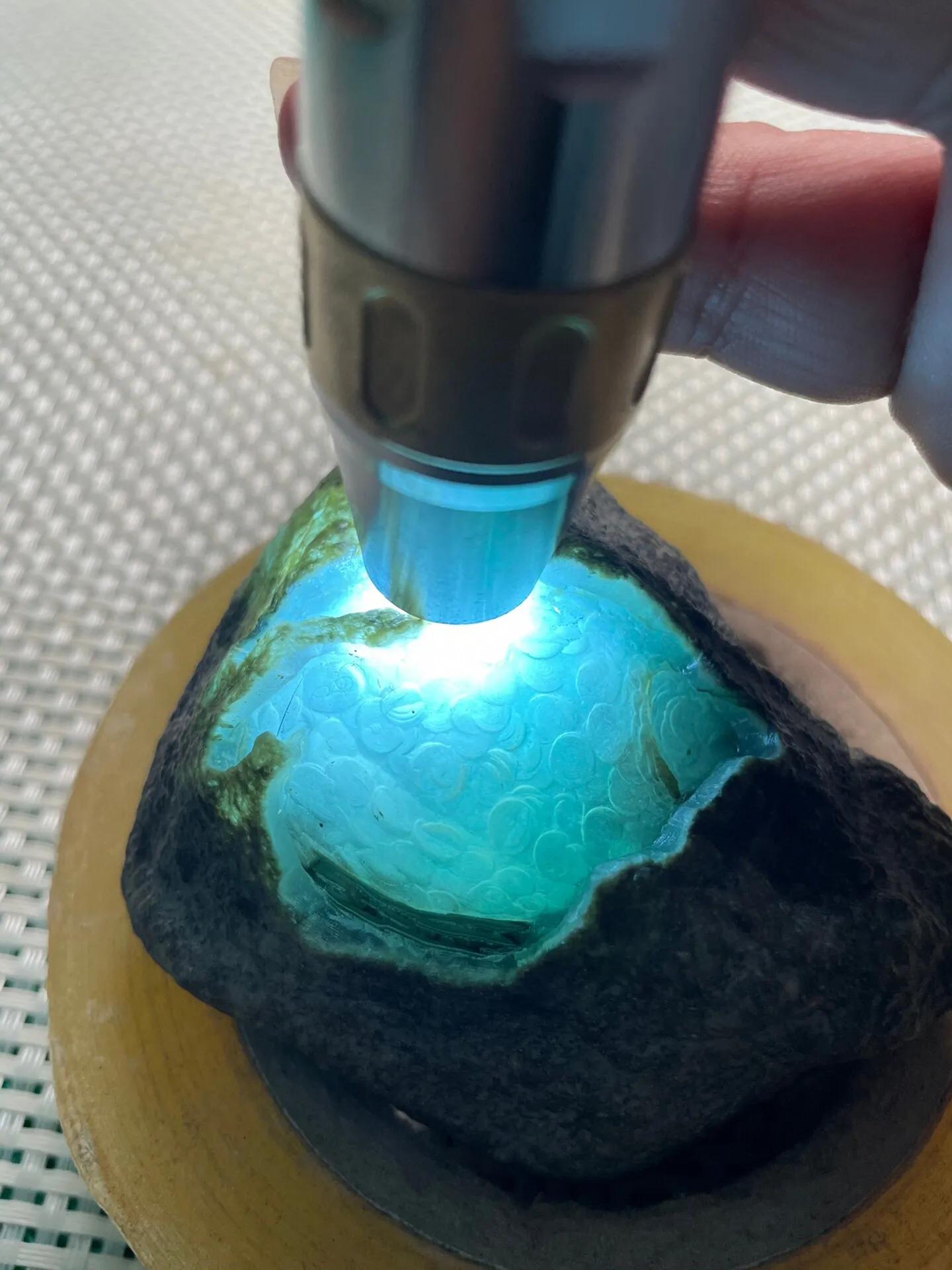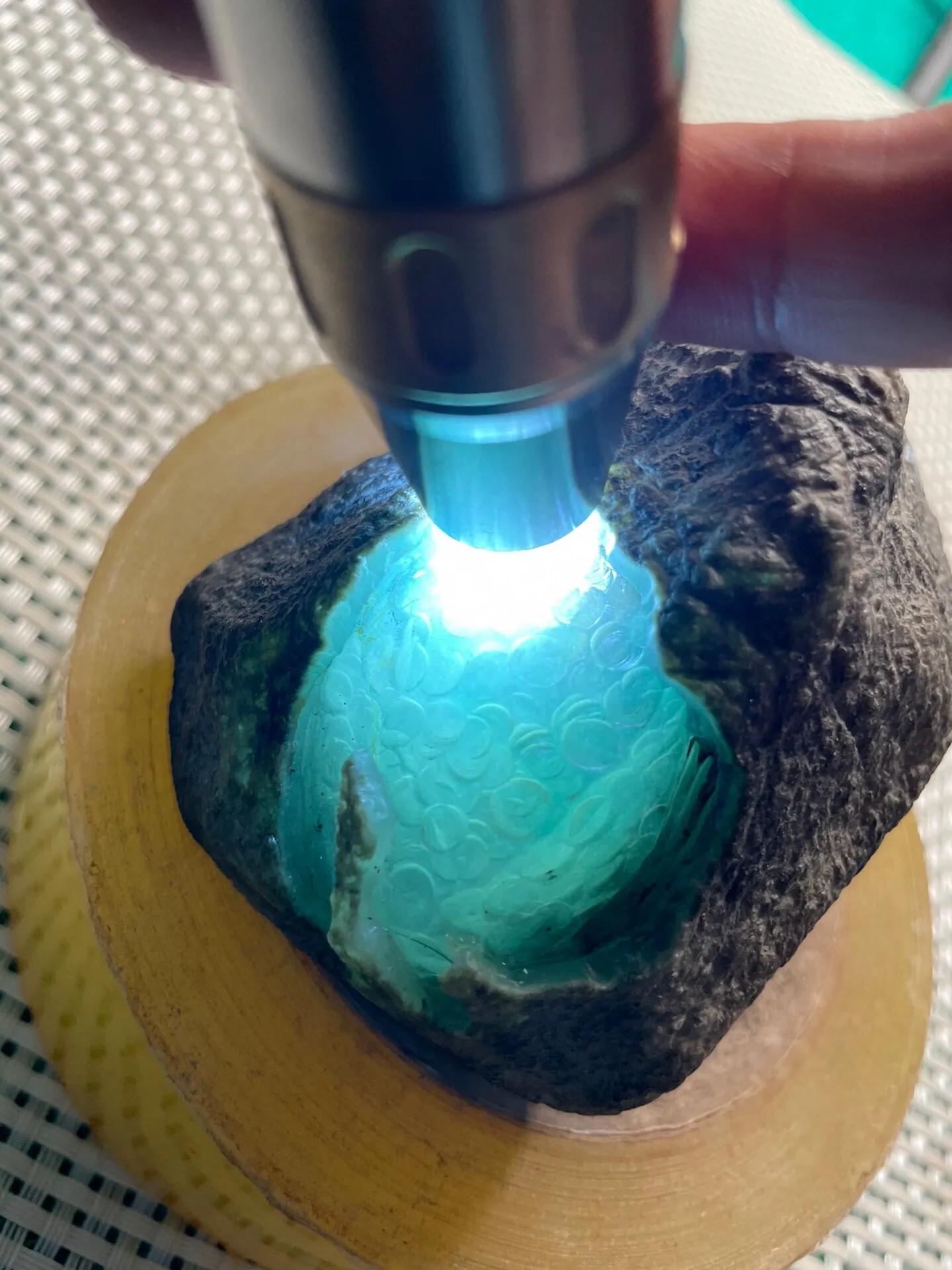 589克,老坑莫西沙大象皮开窗高冰晴底牌子挂件料,料子皮壳老起打邹,开窗位置种老肉细,打灯冰感十足,自然起胶。