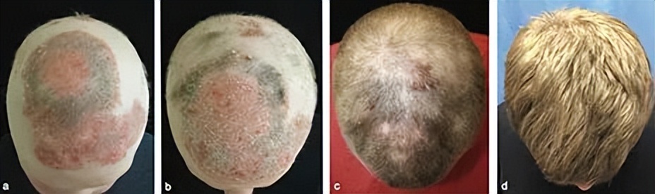 这位患者同时患有牛皮癣和斑秃,在接受枸橼酸托法替尼治疗后,他重新拥有了浓密的头发。图片来源于耶鲁大学