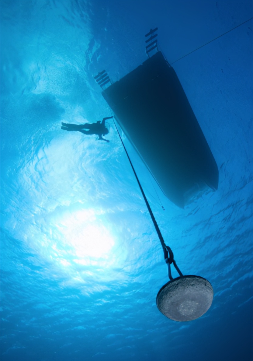 使用的锚绳一般固定在潜点系缆上,那些系缆上不但布满青笞,还可能有蚝壳等尖锐物,最好要配戴不露指的潜水手套。