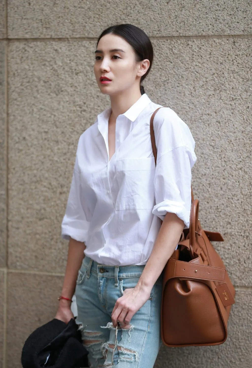 但有时候过于拘谨的穿搭很容易有压抑感,这时不妨解开衬衫上的两颗扣子,制造出V领的领口,再把袖子自然的挽起来,瞬间时髦清爽许多。