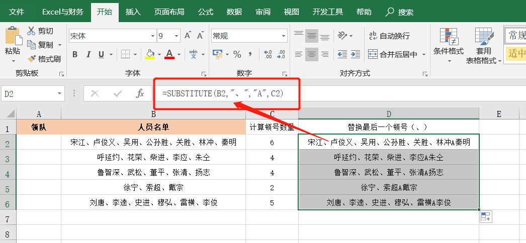 上一步虽然知道了顿号(、)的数量,但还是不能识别最后一个,我们还是需要利用SUBSTITUTE()函数把最后一个顿号(、)替换成别的字符,比如A