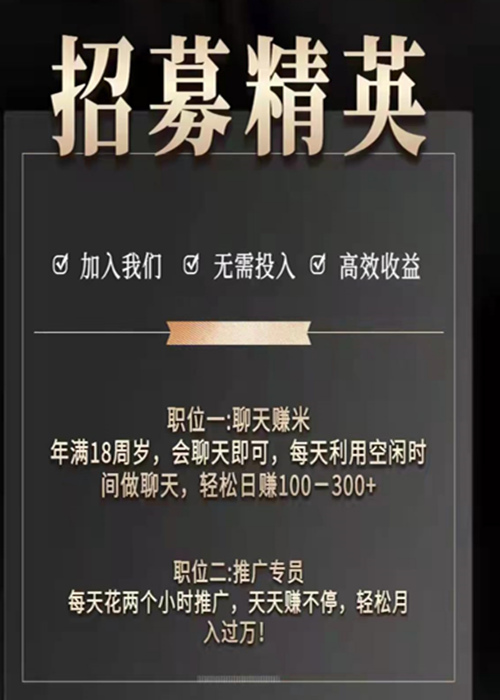 在百度“聊天员吧”,记者随机联系到数名招募聊天员的用户,他们称自己为推广员。他们发来的招聘海报对聊天员的描述则是“年满18周岁,会聊天即可,每天利用空闲时间做聊天,轻松日赚100-300(元)”。