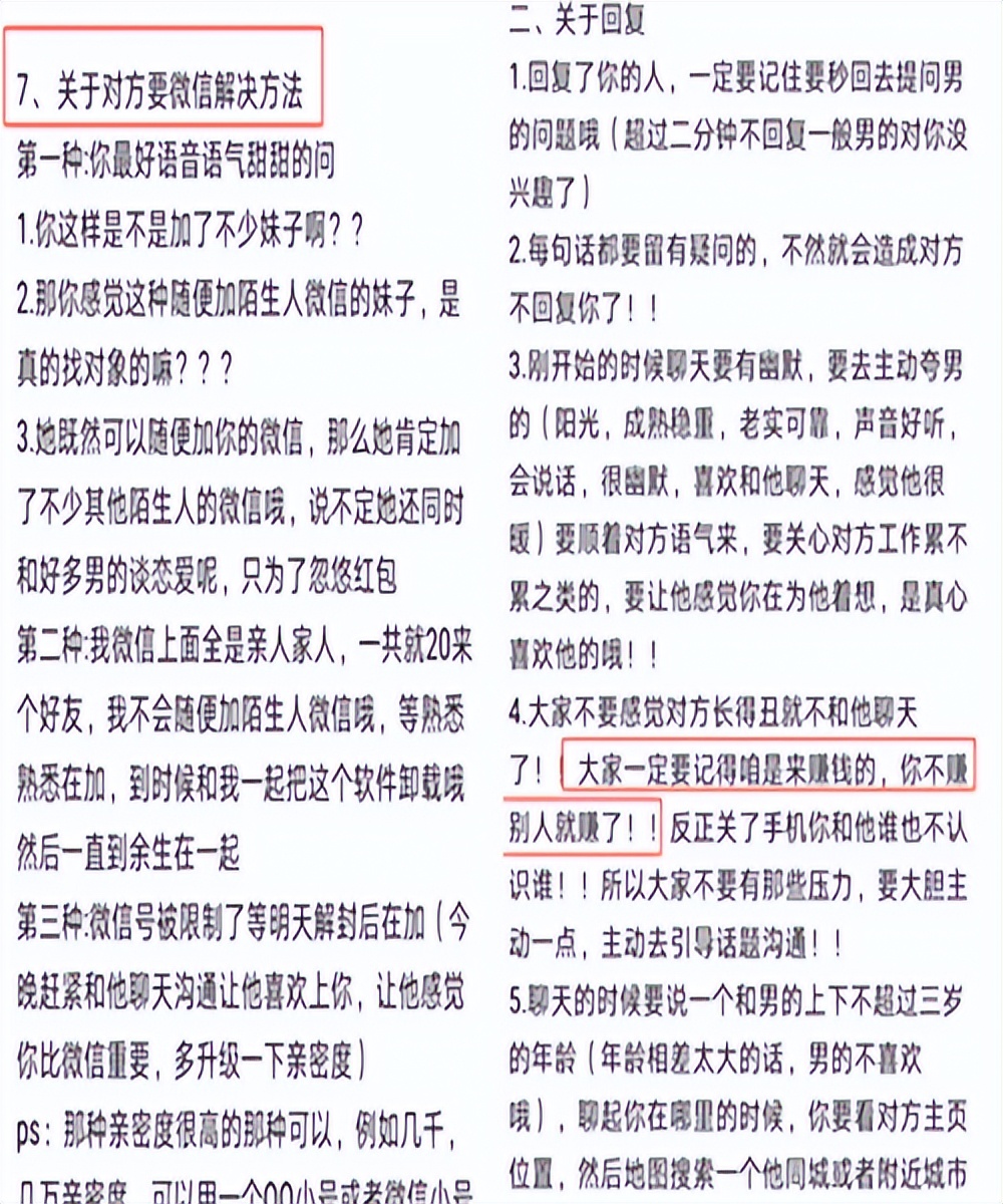 例如,视频的时候穿着尽量清凉;要不时让男方觉得你有要见他的意思,如对他说“我去找你玩”;聊天的时候要演戏,用洋葱和眼药水逼自己哭......