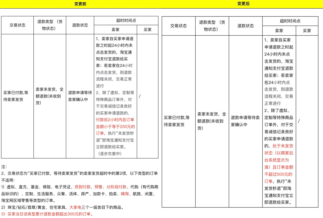 此前,淘宝和天猫的“未发货秒退款”(以下简称秒退)都有统一的前提:付款2小时内,且金额小于等于200元的订单。新规调整为,天猫不限时间、金额;淘宝不限时间,订单(子订单)金额小于等于500元。