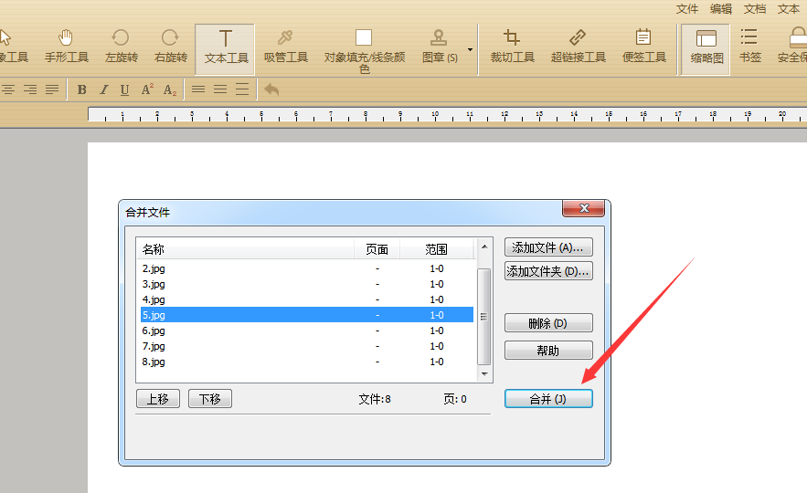 接着添加所有需要合并到一个PDF中的图片,同样也是可以通过设置窗口左下角的上移和下移调整图片顺序,或者我们在添加前可以将图片重命名并编号这样更方便(软件还支持PDF与PDF合并,以及PDF与图片合并),设置好之后点击右侧的合并,然后输入文档名称就完成了。
