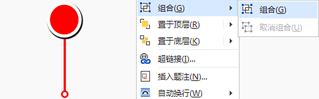 将圆形和红色线条调整摆放好,按住【Ctrl】键,依次选中三个图形,右键单击,点击【组合】,将圆形和线条组合在一起。