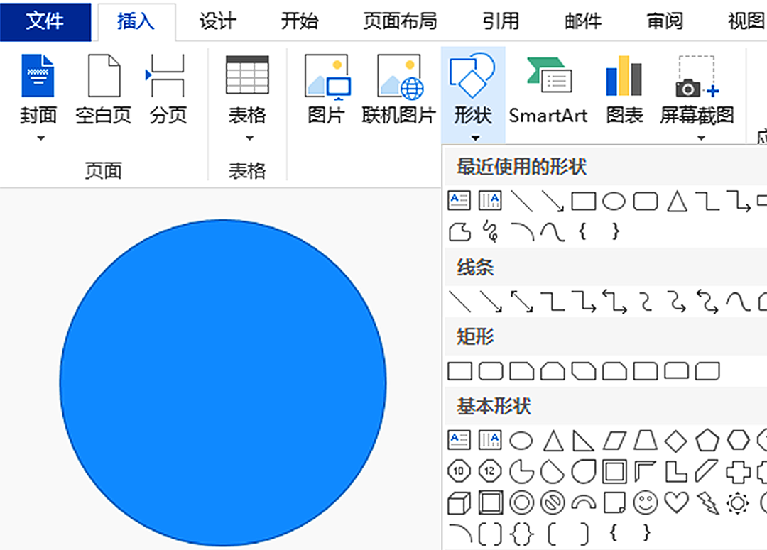 打开Word文档,点击【插入】,继续点击【形状】,然后插入“椭圆”,按住【Shift】拉动鼠标,画出正圆。