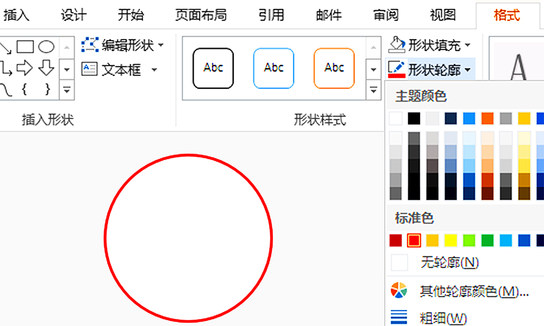 点击【插入】,继续点击【形状】,然后插入“椭圆”,按住【Shift】画出正圆,点击【形状填充】,选择“无填充颜色”;点击【形状轮廓】,轮廓颜色为红色,粗细为 2.25 磅。
