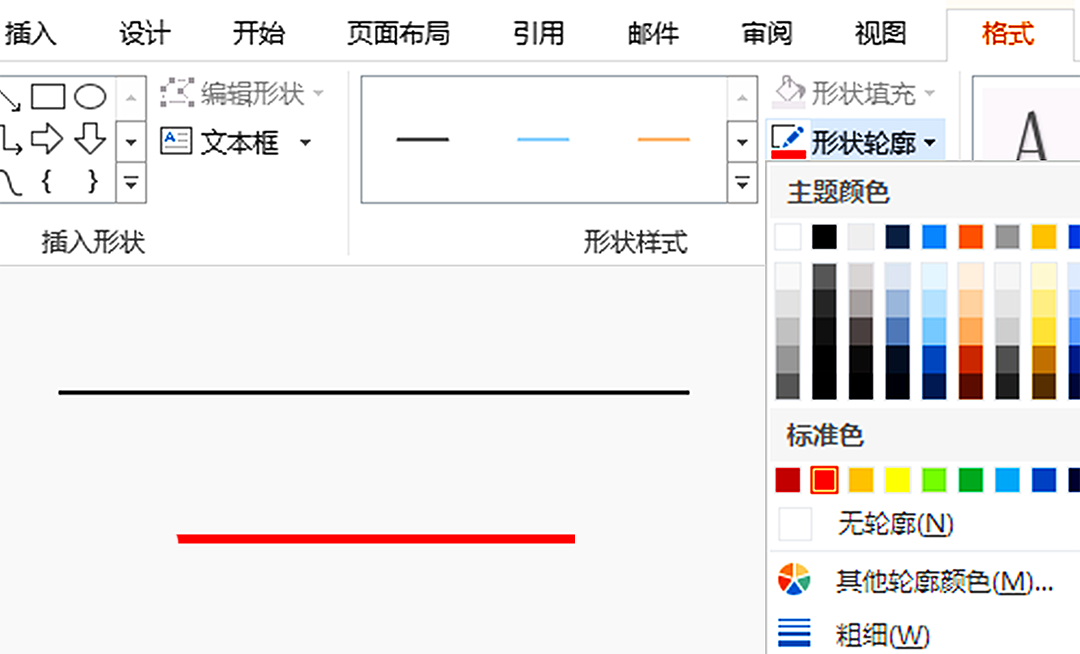 点击【插入】,继续点击【形状】,然后插入“直线”,按住【Shift】画出水平直线,点击【形状轮廓】,调整直线的颜色为黑色,粗细为1.5磅(第二条直线颜色为红色,粗细为3磅)。