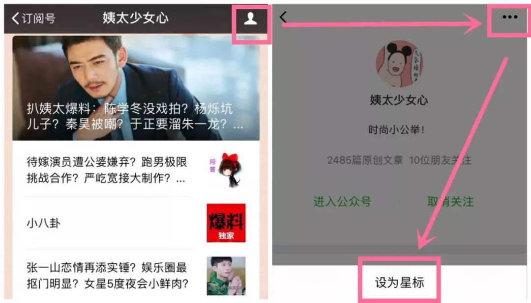 公众号改版后,很多小婊贝们在后台反映说找不到我们了。按照姨太下图推介的方式,给姨太加颗小星星,就可以每天第一时间收到最新推送的爆料哟!